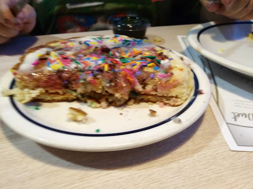 I have always liked going to IHOP, probably a sentimental thing from when I was a kid. I have frequently gone to this particular IHOP and I have watched my favorites leave the menu, and the number of lower cost items shrink. Its hard to find a variety of "normal" pancakes, they have gone to more sweet and dessert type pancakes. This IHOP is wheelchair friendly - the restaurant, parking lot, and the bathroom. It is fairly clean but if you are near the kitchen, rather noisy. Ive seen a faster-than-usual turnover in employees, the waiter we had a few weeks ago was ultra nice - absolutely no complaints there. Still, IHOP is a nice treat, especially for the kids, or if you are in the mood for something sweet and decadent. (IMHO - bring a latte, I dont care for their house coffee.)