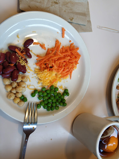This restaurant is not vegetarian. Far from it. Besides the beef chili the clam chowder contained bacon or ham without mentioning it on the description next to it. Yet meat contents are meager in all the dishes, rather, very meager. Other protein contents are also meager except for dairy products. What is the specialty goal of this restaurant? I dont see it. The only thing consistent about the food I can identify is cheap. At $9.80 for lunch (drinks are extra) the cost is way high for what was there. This is the fifth time Ive been to this restaurant. Each time the protein has become more sparse. Theres not even a warm vegetarian dish with abundant protein such as beans. They had lots of staff there but still I saw fruitflies buzzing around the salads. Can I say something positive? The muffins tasted good. Still, muffins are greasy and so were these. Wife and grown son came too. We all agreed, not a good experience.