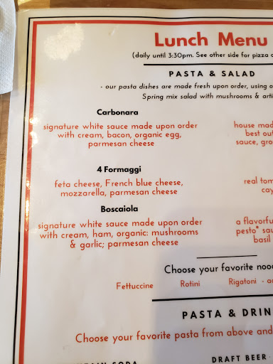 Pizza crust is so thin it is like a tortilla. Service is not good. I was served one small glass of water when seated and never got a refilll. The excuse was that they were busy and a very small restaurant. You need to allow 2 hours to eat there because you will have to wait so long for someone to take your order and then wait again for the food. Is the food worth the wait? Not really. Overpriced very thin pizza.