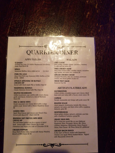 Went there for dinner with my fiancee. One one the worst food experiences Ive ever had. The menu offerings, seasonings and service were awkward at best. The only saving grace if any was the root beer on draft. Maybe we should have gone for lunch but I will not be back to try. I should have left as soon as I saw there were no traditional diner food options available. We also should have known to leave when as we entered Quarrier Dinner an hour into dinner service, we were the only patrons and remained so until we left there by leaving the place empty. Overpriced semi-gourmet blah. I would have been much happier with almost anything from any diner anywhere but here. To sum it up with an example, there had ketchup and mustard on the table yet not one menu item could be used with these condiments. Instead I was given a tomato corn syrup relish, with of all things curry, to dip my over soggy breaded ginger -licorice? fried oysters in to. AVOID.