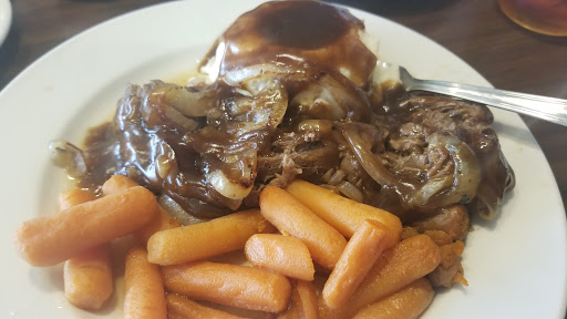 When traveling home from Indiana to North Carolina we decided to stop and eat here. It took a few minutes before my mother and I were seated. Staff was less than cordial. Our server wasnt very nice at first. Then we ordered our food, and while we were waiting I checked the google reviews and read them aloud to my mom. While contemplating whether to leave or not, the staff noticed what I was doing, and suddenly the customer service shot through the roof. We were checked on every two minutes, the manager even stopped by to check on us, and made sure we were taken care of. However my mother noticed the hostess coughed harshly into both of her hands, and then proceeded to grab two menus and seat an elderly couple handing them the menus. Now the food was edible, but not good, potatoes were cold, but dessert was excellent. If youre starving stop by, if not theres a Taco Bell next door.