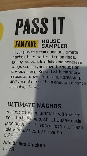 Food is amazing!! I love the chicken tender salad and the boneless wings!!! YUMMM