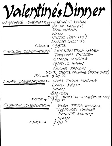 Only Indian food gig in town. Prices are uncontested. Setting is very stark. Nothing more than a fair Indian meal. The food is not too bad. But consistency & quantity is variable. They just got a new cook & @ my last visit blamed him/her for serving me in a much smaller bowl than usual. Did replace only one out of the 3 orders that we had for the right quantity. The place does not have any specials; not even on a special occasion like Diwali. Afternoons buffets are ho hum; nothing out of the ordinary, & bland for the traditional non-vegetarian, but, OK for the uninitiated asking for an Indian meal. A la Carte is the way to go if you really want to. The liquor pours are generous vs other nearby restaurants, especially if you ask. Overall, OK for a quick evening out, but not the place for a romantic getaway. And once again, very pricey for the food... vis-a-vis standard Indian fare elsewhere.