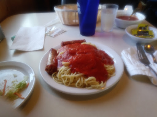 I ordered the spaghetti with sausage and it may have been the most disappointingly bland food Ive ever eaten at a restaurant. The sauce was like weak ketchup, salt and oregano. The sausage was as far from Italian seasoning as humanly possible; it tasted like meat seasoned with barely a touch of pepper and fried in chicken fat. Even the plates, silverware and decor were uninspiring. The food came out fast and the staff was great, but the food was inexcusable.