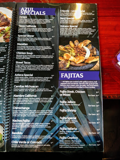 We love Azul! We always order the chicken chimis and they are great! The prices are good, the service is excellent and the atmosphere is very fun. I love the tall benches in their booths, it is great for business meetings. It gives you more of a private feel while you are eating. LOVE IT...LOVE IT...LOVE IT!