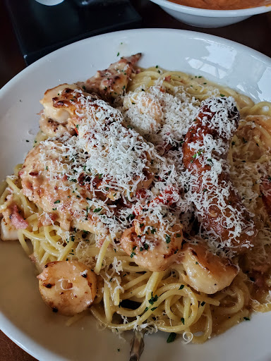 Soup was good. Two of us had shrimp scampi. The other had the lasagna. The scampi was very bland and the lasagna was very dry with very little meat sauce. Told the waitress there was so little garlic in the scampi you couldnt even taste it. She said you should have told me if you wanted more garlic. An Italian restaurant with practically no garlic. What a joke. Ordered soup to go. She asked if I wanted a pint or a quart. Told her a quart. She came with a gallon and then picked a fight with me when I said I ordered a quart not a gallon. Said I was was wrong that she came back to the table twice to ask me. She didnt come back to the table until we were ready to go and then brought out the gallon. $54 and $14 more for the soup to go. Thats a little expensive for bland food and a rude waitress. Wont ever go back.