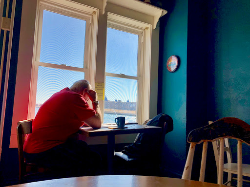 i go there a lot to do homework and sip coffee. its very quiet and laid back. there is a room in back to read (with their own library to choose from if you like) and board games. drinks are reasonably priced plus sandwiches and pastries. beautiful view of the harbor too. one of my favorite places in town to go.
