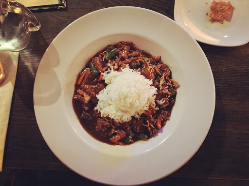 This was my first time having Indonesian food (at least, that I can remember as an adult). I was here in a group of 7 and they gave us complimentary tempeh chips that were interesting in a good way. I ordered the beef rendang and my girlfriend had the opor ayam. I thought my beef was pretty good but the broccoli that came with it, although it tasted fine, seemed out of place. The opor ayam was way too salty for my girlfriend so we ended up swapping plates in the middle of the meal and it was pretty salty for me, too. But, you know, gotta be a good boyfriend and all that. We had no problems with the service or anything of that sort.