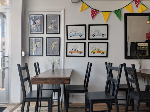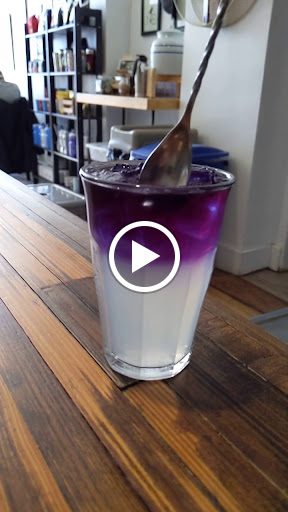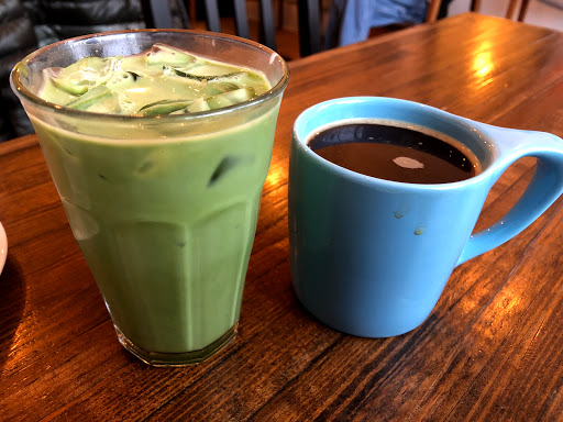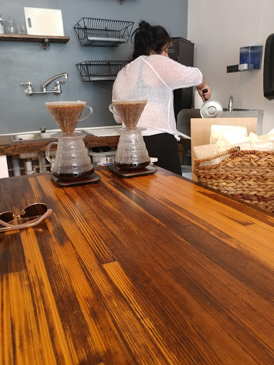 Ive been here twice now, I think its my new favorite coffee shop. Its small, 3 tables that fit 4, and 4 individual lounging chairs with a side table. Im a tea drinker, and they serve kilograms tea in tea bags. They have a small selection of pastries from batch bake house. It is next door to Cargo bike shop, and they share an entry way inside the shop. There is lots of biking themed art. Well lit space with natural light.