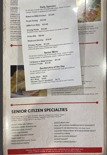 I had the Atlantic Cod Fish dinner which was just ok, at $11.95...I think they could have given a free dessert! They did offer it to my friend who had a turkey dinner!...They were both off the dinner menu...??