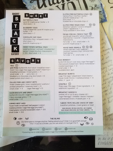 When I first moved to Madison earlier this year, Short Stack was quickly my favorite restaurant. Great for breakfast, brunch, and even late nights on the weekends. In the past few weeks, however, I feel the quality has gone down and is not really worth the price anymore. I think they may have gotten new chefs or staff, I see they have a hiring sign up in their window. Lately the food has been lower quality (I got served cold poached eggs, salad had no dressing on it, other small things). The pancakes are consistently good (chocolate chip and sweet potato), the breakfast burrito is amazing, breakfast sandwich is also on point. The biscuits have been dry the few times Ive tried, the blind special yesterday was TINY (but I guess thats what you get for half price). I would still recommend it, but unfortunately it will no longer be my go to spot. Instead of coming here regularly it seems more worth the risk to try new places for something better.