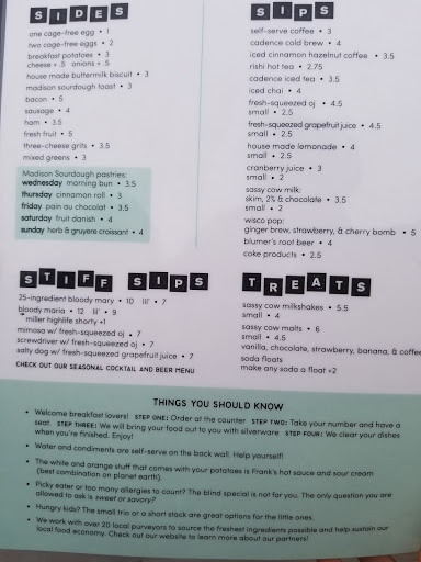 Odd hours, but being able to go and get the best breakfast in Madison anytime between 7am on Thursday and midnight on Sunday is the savior of every college student, from the inebriated to the starving night owl. The food is phenomenal, local, and reasonably priced for the quality. Good coffee and cocktails are a huge plus, not to mention a good rotating selection of beer. However the star of the show for us students is the blind special. 6.50 if you dont ask what it is, 11 if you simply must know, for the adventurous of us, its an incredible deal. You CAN however ask if its sweet or savory, which could be the turning point if youre not looking for something to satisfy a sweet tooth.