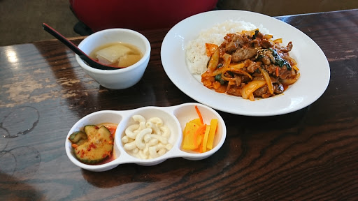 Delicious Korean fusion food! My friend and I went there for lunch and had a flavorful meal. She got the chicken Ramyon noodle soup. She ordered it with a level 3 spice and was not disappointed. I went with the pork Bulgari and it was delightful. I chose to go with a level 1 spice level and thoroughly enjoyed my meal. In addition to the mini corn cake, Kim Chi, and broccoli florets that seem to come before each meal, I got a soy based potato soup that was quite delicious. The lunch meal portions were so generous that both my friend and I needed containers for leftovers. The price for 2 people having lunch came in around $$ but we werent looking for budget conscious options. I plan to try more dishes in the future and hope this review inspires others to try this cozy restaurant.