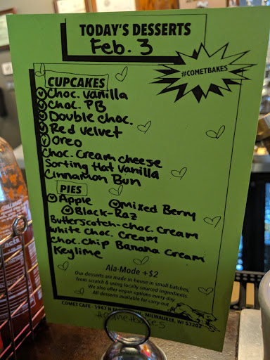 What a Surprise!!! I always go out of my way to find spots like this! We had to wait a bit because tonight (first Tuesday of every month) was Beer School! Other than the short wait, this is a must do place in Milwaukee. Little did I know that they had been featured on the Food Network, I found this place through TripAdvisor and what a find it was! We had a delightful waitress who was very attentive and a wonderful guide to ordering our fabulous meal. The menu had so many twists on old favs that it was hard to decide. So hard in fact that each of the three of us ordered something different with the agreement to share each of the dishes. We had a Meatloaf Sandwich - A bacon wrapped chunk of meatloaf wrapped in bacon over bread covered with cheesy mashed potatoes all covered with beer gravy! Next we had a Cheesy Ruben which was served open face covered with multiple cheeses and a generous side of fries. Lastly, there was the turkey and cheesy mashed potatoes combined and made into three apple sized deep fried meatballs in a shallow bowl of turkey gravy! All three were great but the fried turkey and mashed potato balls were my favorite! In addition to Beer School on the bar side of the cafe, Tuesday is Classic Cocktail night! I thoroughly enjoyed the Manhattan and even challenged the bartender to con-cock a Brass Monkey for me. The atmosphere was busy and a bit noisy but my colleagues and I had no trouble carrying on a conversation and actually enjoyed listening to the occasional interruption as the Beer School instructor informed the participants of their next specialty beer. Pros: The prices were great! The service was excellent! The food was fabulous! Cons: We dont have a Comet Cafe where I live! Probably not on your diet...but youre not going to eat here everyday...so enjoy!