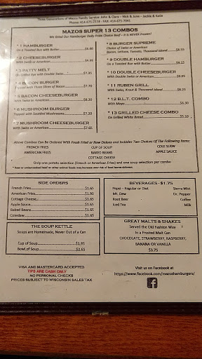 Mazos makes some of the best hamburgers in Milwaukee. You don’t have to believe me, City Search and the Milwaukee Journal both rated it as the best in the city. The food is fresh; this is not frozen meat that has been sitting around. The hamburgers are juicy and flavorful. In addition to this, they have homemade soup (very good). Mazos has been around more than 75 years. They moved to the present location in 1948. Hanging on the walls are newspapers, drawings, etc. from bygone days. The staff is very friendly and will make the burgers to your request. (They have other sandwiches also but the hamburgers are the heart of the operation. There is parking in the rear of the restaurant and the place is handicap accessible. Two things to note: on weekdays, the restaurant closes by 7 pm and - it is easiest to access the restaurant if you are traveling north on 27th. The restaurant is just short of the 27th and Oklahoma intersection which (with the huge Aurora hospital) can be very busy. It is worth the trip.
