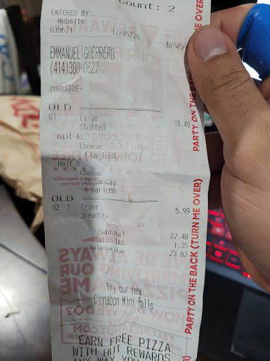 Order my food at 11:18 called 5 minutes after ordering and they say the delivery guy left already. I called to make sure my ranch and stuff was in the bag and the lady said it was. Delivery guy shows up 12:12 exactly with no sauce cold pizza and warm wings and a Diet Pepsi in the bag when I ordered a regular one! I call back up to Pizza Hut and I get no answer! I will be calling in the morning to get my money back.