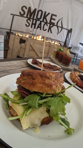 Went in to Smoke Shack today to try their new Blues Brunch Menu. Ive been to Smoke Shack several times and have always left happy. This time was no exception. It had been a while since I was there the last time and some of the faces in the crew were new to me, but that didnt keep them from treating me like wed always known each other. The other person I was with had the chicken and poblano waffles. Id never thought of adding a savory to waffles like that, but Ill be damned if it doesnt work. The chicken was a surprise 1-2 punch with it being smoked like their chicken normally is plus with a light breading with a hint of cayenne in there. The chicken & waffles comes with a side of a thin apple syrup that is perfect for dipping or pouring without it ever becoming like a thick glaze that some syrups can. I had the make-your-own gravy & biscuits. I had it done with the Berkshire ham, an extra side of andouille sausage, and an extra side of the gravy. This came with some homestyle potatoes that were so good I didnt need the extra side. Im one of those people who will put sauce or gravy on just about anything. The ham was amazing. Slices about that of thick cut bacon, biscuits that are a meal unto themselves, a gravy that tastes home made (read: not just pepper + slurry + butter). I ate maybe 2/3 of it all and took the rest home. Huge and filling. Over the course of lunch, wed started mixing and matching. Chicken dipped in the apple syrup, waffle dipped in gravy, ham dipped in the apple syrup. Everything tasted like they belonged together no matter what we experimented with. Now, before I forget, we started the meal off with a cinnamon roll. The size of a small hat, this roll came to us with a side of vanilla icing. Not so sweet that it makes your teeth hurt, you could taste the roll itself, you could taste the cinnamon (instead of just a punch in the face of sugar+butter+cinnamon, see above for teeth hurting), and when you used the icing, it was a very good balance of lightly sweet and lightly vanilla, more subtle than bold. Ill put it to you this way, we already planned our second trip for Blues Brunch in October, this time, bringing more people so we can all sample more items off the menu.