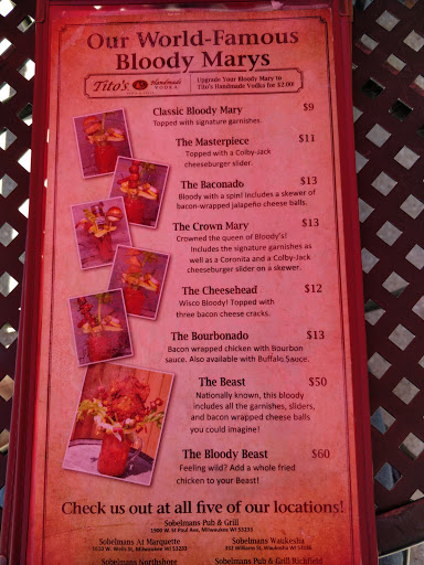 Sobelmans is a destination if youre in Milwaukee. The burgers are juicy and the Bloody Marys are delicious as well as bountiful. Save room for both. We went for Mothers Day because my mom loves a good burger and she was not disappointed. I had a melt and everyone else had various burgers that they couldnt say enough about. My dad even liked The Bomb so much he didnt even use ketchup or mustard on it. I wanted to go here for the Bloody Marys and I was happy I did. They are great tasting and have all the accoutrements like bacon wrapped cheese curds, cheese wedges or even a whole fried chicken. Whatever your taste is. I cant forget the customary, Wisconsin, beer shooter on the side or root beer shooter if you get a virgin. I cant go wait to back.