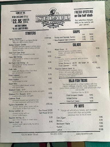 Although I had sampled their great soups in the past, this was the first time I went to St. Paul Fish Market for a full meal. I was going to sample a couple of different oysters, have a soup, and then try the $12.95 steamed lobster. Before I could order, the server alerted me to the "Monday Special," steamed mussels in a garlic and butter sauce for $4.95. She didnt have to say that twice! She also mentioned that oysters were the "Thursday Special" with two for the price of one. How could we Scots pass up a deal like that? The setting and decor will take you to the typical Maine, Massachusetts, or Rhode Island sea food market who also cook and serve their own wares. In other words, it has that wonderful atmosphere about it. The mussels were the best I have had in many a year including my years living in Naples, (Italy) where I used to order them to start just about every meal. They were also a large enough order to have been the main course. The New England style clam chowder came next and it was so rich and creamy that I could tell that I had better take most of it home so as to leave room for the lobster, which, by the way, was extracted from the tank in front of me when I first ordered. The lobster itself was delicious not over done, and of a size that wont crash your diet, circa one pound. It was served with drawn butter, french fries, and cole slaw. The fries were run of the mill and the cole slaw was OK but could have used something more ...but then again I have spent a lifetime trying to perfect coleslaw on my own and I am still trying to at least duplicate the slaw served at the old "Five and Dime" without success. I cant wait to try the oysters on the half shell and the fried clams. The St. Paul Fish Market is a treasure that I have missed until now. You wont feel rushed. If you are going for the lobster, bring a sea food fork. It will make your life a lot easier. If you are one of those unprepared people who dont carry a sea food fork around with you regularly, well, just go anyway. You wont regret it.