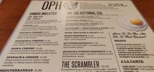As with all OPHs you should arrive knowing there will be a wait, so plan for it. If you dont have to wait that should be considered an unexpected bonus. In reply to the previous comment, If youre a regular loyal patron anywhere you might get friendlier service, what else would you expect? The food is generally consistent, ample & tasty. If youre okay with paying a bit extra they are always happy to make things to order and arent stuck on the menu. Thats why I go to OPHs. OPH has best omelets cause they bake them up light and fluffy. Really good bacon. And I always ask for a to-go box with my order. More yum for later.