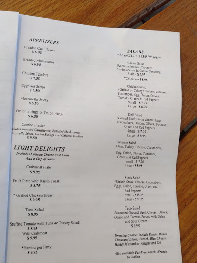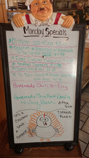 Homey atmosphere, enjoyable food. A change of pace, get Taco salad, but instead of salsa, try vinegar & oil, its lighter & doesnt lay as heavy. Great steaks on weekend, some available daily. Love this place for years with many different owners. Remember Friday & Lemon Meringue pie.