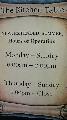 Recently became aware of the Kitchen Table and tried it for breakfast with my wife. Weve enjoyed it every visit since. Its become one of our favorite breakfast spots. The service is hit or miss, at least during the day since thats the only time weve been, but thats not too surprising since they seem to employ a younger crew (which I appreciate since I love this small town).