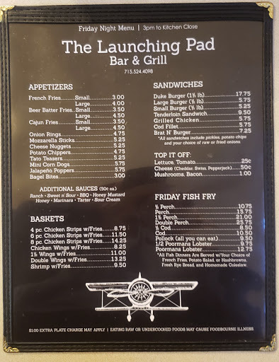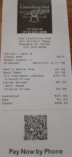 We had great service great food great experience. I would recommend the Launching pad as a great place to go to eat.