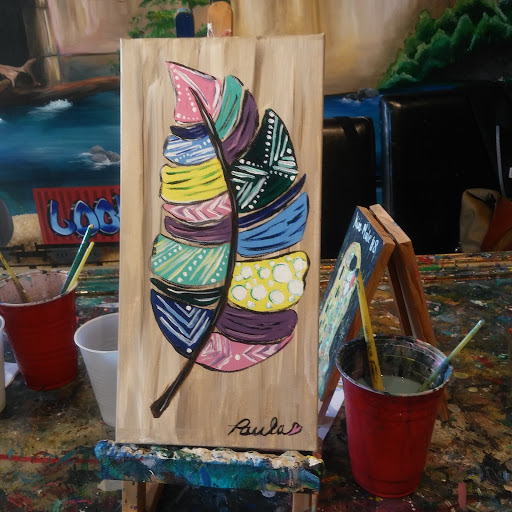 My wife and I visited for the first time on a Friday night and were extremely surprised. We really enjoyed the atmosphere even before entering. Outside they had live music, patio seating, dance area and drinks. Once you enter a host greats you and explains how the whole process works. Nancy was our host and she was awesome! We ordered drinks and began our paintings from a selection on the wall that comes with instructions. Nancy brought us our paints, canvas and drinks. We had a blast! If course my wifes painting of a coffee cup was extremely better than my feather painting. All in all four sixty dollars or so it was a great date with my wife. I do want a redo of my painting so we will visit again