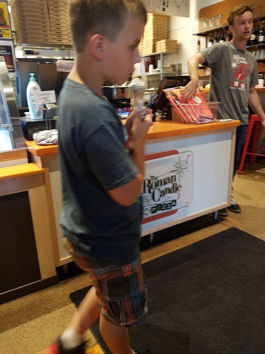 Nice place to bring the kids. It has a kind of cool retro 50s space age theme to it (I think "Roman Candle" was slang back then for rockets). Theres a large selection of toppings and crusts.