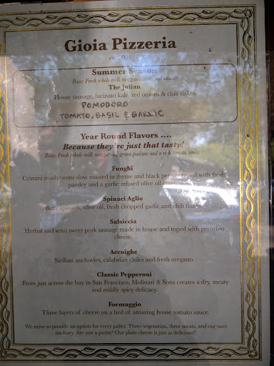 The pizza here is excellent. The service unfortunately leaves a lot to be desired. On a Friday, I called in a pizza at 4pm for a 6pm pickup. Arrived at 6 to pick it up and the line was out the door. Another customer told me that she was told by the staff last time when she ordered ahead that she could go ahead to the counter. I proceeded to the counter and was told pretty directly by the woman there that there was only one line. Ok. The line was about fifteen people long, and I did order ahead 2 hours ago and now my pizza is getting cold, but I sort of understand. (Years ago, I worked in pizza and I know it can be really hard work.) For the next 20 minutes, I stand in line waiting for my pizza, arriving at 6:30. When I finally(!) get to the counter, another gentleman comes up, having skipped the line to pick up his pre-ordered pizza. The woman who told me earlier to get back in line, hands him his order and lets him pay in front of me. After I stood in line for 20 minutes. Great. Gioia, I have other good pizza options in the area and I think Ill be giving my business to them instead.