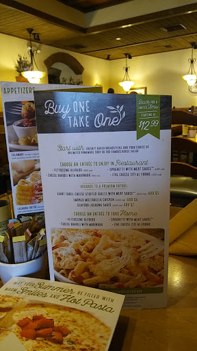 The only reason I come to Olive Garden is because most of the people I know love to come here. It makes sense, its inexpensive but the pasta is not all that great. I could make better pasta at home, but dont or else I wouldnt come here. The good thing is that they do serve you a lot so you could take it for left overs. My left overs tasted better than when it was "fresh". The pasta tastes like it came out from the box. I have tried better shrimp pasta from Kickin Crab. Just thinking about it makes me want to go there for the pasta. At Olive Garden, the display looks better than what the pasta actually tastes like. I suggest taking the soup to go and if you have left over reheat at home on the stove; that way you can add flavor to it.