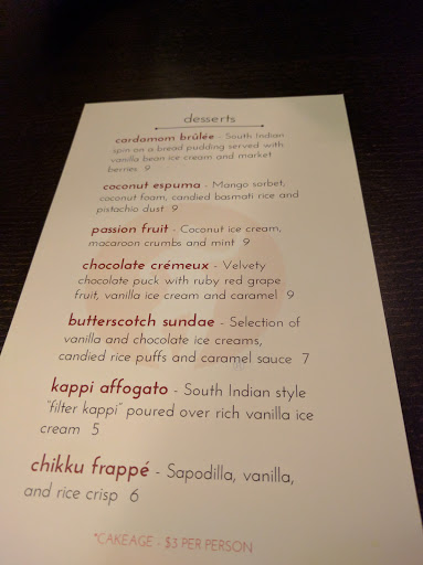 The food is beautifully served, and its truly delicious. Service was great. Dishes are on the smaller side, yet priced higher than one might expect for their size. Not beyond reason, but still. Somewhat of a shortage of vegan menu items (they did go out of their way to prepare the items for us without cream, yoghurt or butter) - I recommend the delicious wild mushroom uttapam, the very small but tasty fruit salad and the coconut veggie curry. There were no real vegan options for dessert. Acoustics were a bit on the louder side upstairs due to the low ceiling and number of tables in the space. Overall, we enjoyed the experience. 2 people without drinks, tiny salad, one starter item, one main menu item, $57 before a 20% tip which our server well deserved.