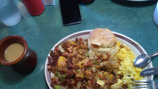 It is what it is -- a greasy spoon doing breakfast. The coffee was pretty lacking, but the food was good and the portions were huge. The server was very friendly and took our Entertainment Book coupon without issue. The way they did the potatoes (not that stringy hashbrown stuff, but real potatoes) was yummy. I came starving and could barely finish half of my scramble... Ill definitely be splitting next time... the California Scramble. And yes, its good enough for there to be a "next time."