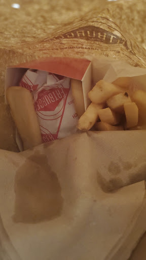 THE FOOD WAS OKAY THEY NEED TO KEEP THE PLACE CLEANER. WE WERE THE FIRST CUSTOMERS WHEN THEY UNLOCKED THE DOOR AND IT WAS KETCHUP SPLATTERED ON THE FLOOR, PIECES OF TRASH ON THE FLOOR AND THE RESTROOM WAS OUT OF ORDER.