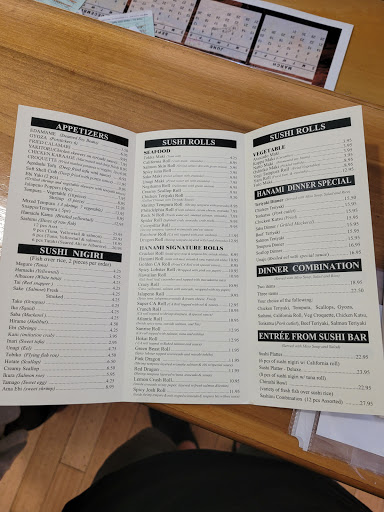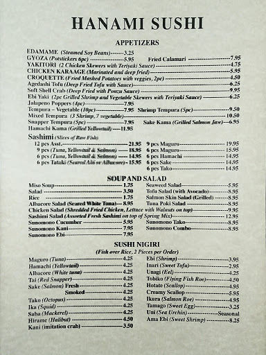 Excellent Sushi, great selection of Bento box meals, Soups and Vegetarian selection. Portion servings are generous. Affordably priced menu--$2.95 items - $15.95. Lunch: $6.95- $9.95. Dinners from $8.75-$13.25. Sushi from $2.95 - 10.95. Nigiri 2 piece orders are $2.95- $4.25. Restaurant is exceptionally clean and well lit. Service is friendly. They always bring a fork for my husband, since he is chop-stick challenged. Bathrooms are spotless, restaurant floors are so clean and shiny you could eat off the floor. I have tried just about everything on the menu--only exception has been the scallops-Im not a fan of scallops--so no negative to the restaurant. Hanami does have take out, I prefer to eat at the Restaurant- forgot to mention--Miso soup is served to perfection, not too hot, just enough tofu. Recommend the Caterpillar Sushi Roll, (shrimp tempura, cucumber, topped with avacado). Tempura has the right amount of crunch, you can taste the shrimp with every bite, cucumber is crisp, avacodo is firm and sumptuous. Just too darn good to describe. My mouth is watering... The Dragon Roll is also excellent, same as above served with Eel. The Dinner Specials are quite filling, recommend Salmon Teriyaki and Beef Teriyaki combination. The Noodle Soups are enough for two people, recommend you share Tempura Udon - which is Chicken Tempura and vegetables. Hanami has a large Vegetarian menu as well- Curried Rice with Tofu, Vegi Tempura, Avacado Maki and Seaweed Salad are my daughter in-laws favorites. All food items are fresh, cooked to perfection and absolutely delicious. After lunch or dinner go next door for Gelato.