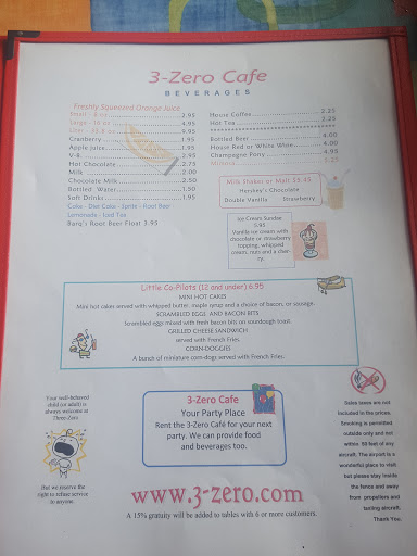 The food at the Three-Zero is amazing, and freshly made just for you. However, because of this, it can be slow. Also, the drink sizes are a bit small, and you have to order more, there arent really refills. The view from the back if the diner is great, you get to see small planes taxiing and taking off. If you have time enough, the café is a great place to go for breakfast.