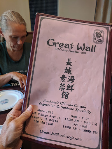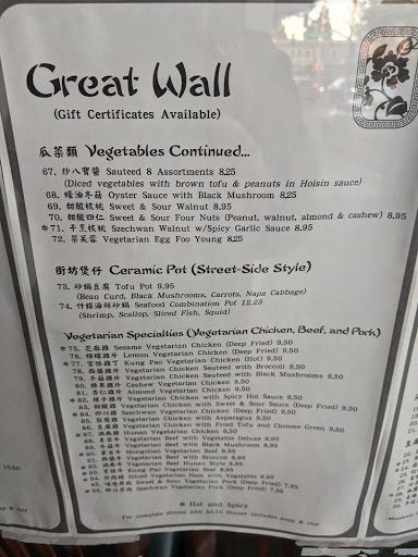 Great wall is awesome. Reasonably priced and lots of options for fake meat living vegetarians.
