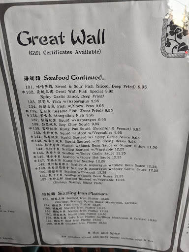 I love the great wall. Their fake meat tastes very realistic. The service is great, the staff picks up if you would like to be left alone or need something. It is not too pricey for the service and quality of food you are getting. I dont think Ive ever had to ask for water and the guy that pours it, does so with finesse and great skill!!!