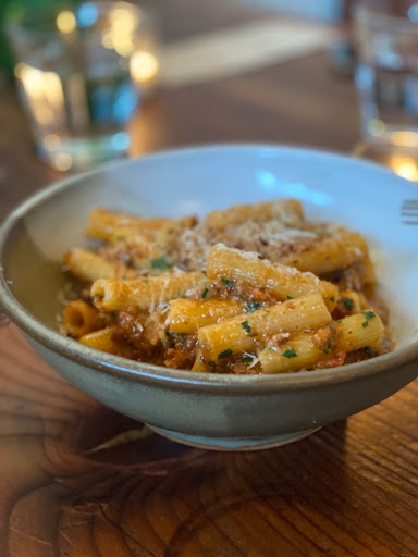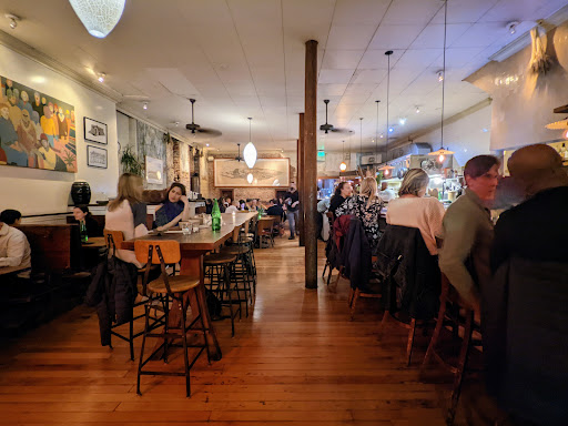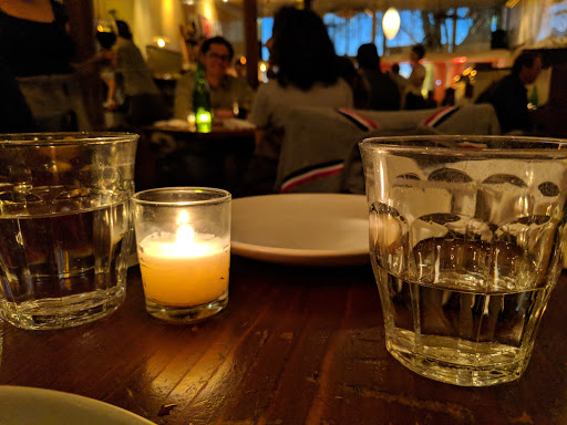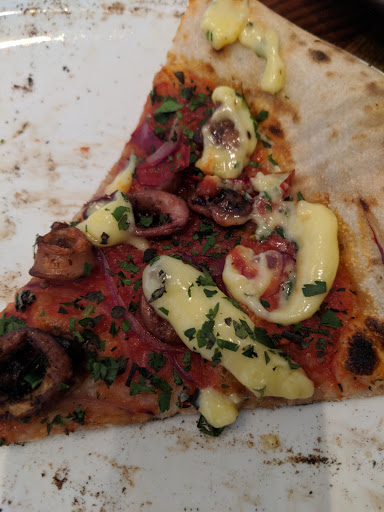Honestly, I think people are just into the atmosphere and they have convinced themselves the pizza is good. We were still so hungry after 2 pizzas, 2 salads and 1 appetizer that we went next door to Dona Tomas and had a supplementary meal! - The atmosphere is nice; it is warm, cozy and rustic. - Our server acted like he resented doing his job. He barely spent any time with us, acted impatient and was just cold and almost rude. When we said that we did not eat pork and were looking for choices without, he said, Okay, I will come back." Thats just bad service. - The pizza: we got a margherita which was bland and one other pizza which had a good blend of items. I just do not think the crust is good at all! Talk about boring. Fresh baked never tasted so dull. - One of the salads we had was good (dressing, quantity), the other was so small we laughed when it came. I would rather have made my own organic salad with veggies from the farmers market, grabbed a never disappointing and delicious pizza from Arizmendi and popped open a bottle of wine and saved my gas money and tip. Will not be going back!
