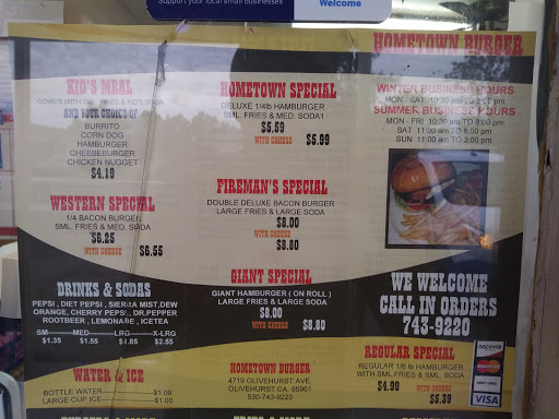 This place is a simple, no-frills hamburger stand on Olivehurst Ave. Olivehurst, Ca. They feature an extensive menu beyond merely hamburgers, e.g. hotdogs, corn dogs, milkshakes, etc. A look at the menu reveals a few specials to make ordering a breeze. I order the Hometown Special with cheese: a single cheese burger, fries and a soda. Its a burger the way a burger from its class should taste, pure and simple. Delicious!