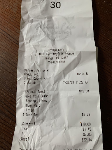 The Orange Cafe would have received a 5 star rating, but for their lack of ventilation & tacky decor. The food was EXCELLENT and I do mean EXCELLENT. The same with the service, you had one waitress servicing a slew of tables, but you wouldnt know unless you paid close attention. Thats because, she is so good at what she does. Moreover, I never once had to look around to call her, as it seemed as if she could read our minds if we wanted something, as she was "Johnny on the Spot". Believe me, as Im not being patronizing for the sake of it. This young woman is one of the BEST servers weve ever had the privilege of being served by, without feeling rushed or harried. She simply made the mid morning dining experience worthwhile. We would definitely refer our friends, family or encourage anyone to enjoy a scrumptious mail from Orange Cafe.