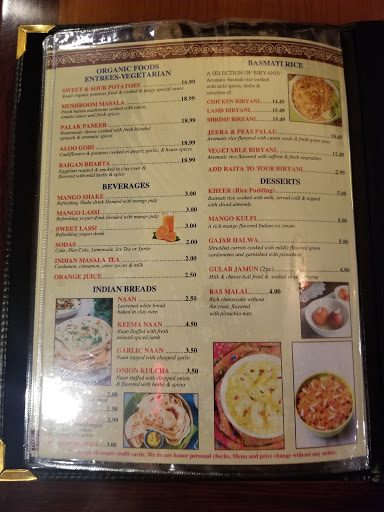The place was okay and the waiters very polite. We ordered a tandoori mix, a chicken tandoori and a bhurta, with nan. The vegetable dish was tasty, The tandoori meats were totally tasteless. They provided a hot sauce which is not a substitute for taste, The waiters indicated they dont eat meat so they have no idea. For three dishes with papad and tea... averaged out to $27 per plate. Would recommend to vegetarians with a wallet. If you like to eat meats with bahari, chapli or hyderabadi tastes go somewhere else.