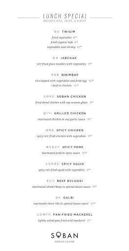 UPDATE 07/2017 Coming to Soban is always good experience. Every time I come here I am always impressed by the personalized service and the fantastic Korean cuisine! I look forward to my next visit so that I may try something new from their menu. I love going to Soban! Great Korean Cuisine run by great people.
