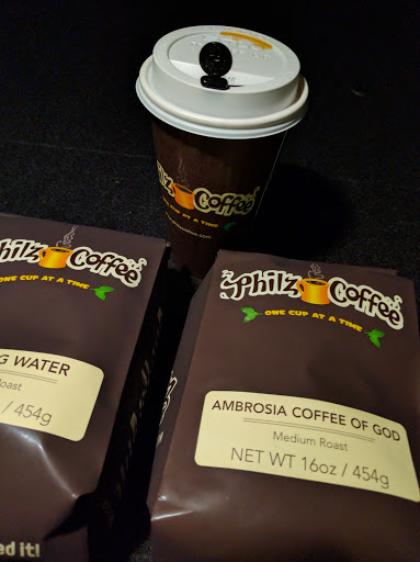 My husband and son love this place. Theyre huge coffee enthusiasts so if they say its good, its good. They will go out of their way to get coffee at this particular location. I have only had the tea here, but can tell you that it is awesome! Very flavorful and fresh tasting, not weak. Philz is in a busy location and parking can be a little tricky sometimes, but its a great atmosphere to sit and sip a cup of coffee before you head off to the nearby theater or just to do some shopping. Its pretty roomy inside, clean, and has a friendly staff. There are two or three tables outside, as well. Overall, a great place to hang out while youre enjoying a really good cup of coffee.