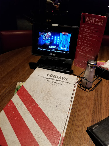 Typical TGI Fridays. Good happy hour specials, especially on appetizers. Love their potato skins and spinach dip. Never get sick of it. A tip to the management though: Turn down the AC because its freezing in there.