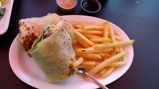 One of my worst dining experiences ever! TERRIBLE SERVICE / POOR FOOD QUALITY! I stumbled across this place. It looked inviting and the menu featured a lot of creative options. There was a lunch special, so I thought I would give it a try. What a mistake! The cashier informed me there was a 15 minute wait to receive my take-away order. After checking-in on the order multiple times, it actually took them 45 minutes to prepare a simple chicken wrap with a side of hush puppies! By the time I got the food, I was so hungry I ate pretty quickly. It turns out that there was a 1/2-inch long, relatively thick chicken bone in the wrap! I almost chocked on it! The staff here do not seem to put the necessary effort in for customer service and careful preparation of the food. Its a shame, this place could be really cool if they worked on managing their operations. The food tasted "alright".. (nothing worth coming back for), but obviously the service and poor food quality (chicken bones still in the meat) are enough reason to avoid this place!