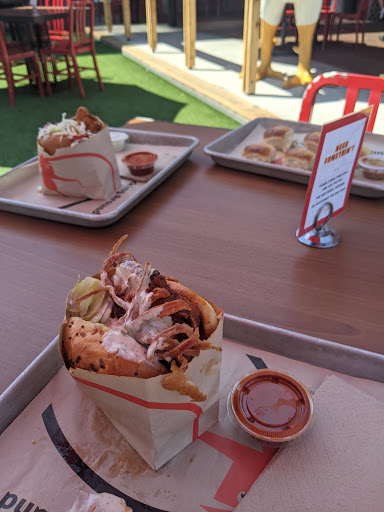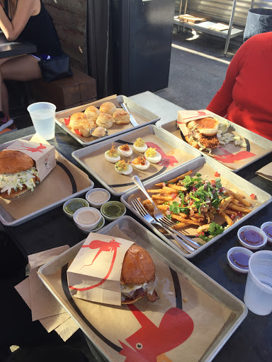 Great tasting food, good beer selection, friendly atmosphere! Price is high for what you get, but I will definitely be coming back with the buds I was finally able to come here with my housemates on a Friday evening (~9pm). Parking: difficult area if you come at a busy hour. We ended up paying for parking nearby. There is a $7 valet adjacent to the store as well. Ordering: a line starting at the ordering counter extends out towards the street. It may have been the customers ahead of us, but the line moved very slowly. To compensate though, the food came out really quickly. Deviled Eggs($6): if youre a fan of deviled eggs, its worth a try, but otherwise it may mot be worth the price tag. You get 6 half-egg pieces, 2 of each of their 3 types. Fries($5): Crispy and well seasoned! Went well with the kimchi bbq sauce. Mexican Poutine($8): Better than the description! For those wondering, it appears they make their own cheese whiz; its not the one from the can they use in Philly. Tasty :) Senor Croque($12): Massive slab of chicken with bacon and egg. I enjoyed eating it with all of their sauces, but it wasnt revolutionary. I would call it a luxury version of CHIK-FIL-A. Looking forward to trying the Coop Deville next time... Fried Chicken($15for5pc): I liked my first piece! Great breading flavor and texture. But I would rather do KFC at 1/3 the price if craving fried chicken. Sauces Chimmichurri: tastes like it usually does, though slightly buttery. Baja Hot Sauce: literally Tapatio Ranch: a good ranch Kimchi BBQ: loved it! Its similar to carnitas snack shacks bacon ketchup. The other two sauces were unavailable. Green Flash Le Freak + Chimay... Loving their beers. A great addition to the neighborhood and a an enjoyable experience for sure!