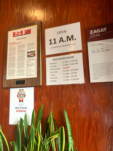 I stumbled upon this gem when my friends and I were trying to go to Tofu House for a weekend lunch but found it closed. I was very happy to find Han Il Kwan though! My first time was with a group of 4 and we came at an odd lunch hour, so it wasnt crowded at all. We ordered the seafood pancake, spicy hot beef soup, kimchee tofu soup, and clay pot bibimbop. Im not sure if its because we were super hungry, but we were really satisfied and happy with most of the food! I ordered the tofu soup, which was subpar, to myself but had buyers remorse when I saw my friends spicy hot beef soup. Everything was a huge portion though so we were plenty full and had lots of leftovers at the end. Second time was recently when I went with a bigger group for dinner, so reservations had to be made. This time I made sure to order the spicy beef soup and shared the bibimbop with a friend. It mightve been the fact that it get super packed for dinner, but the soup wasnt as good as I remembered. Bibimbop, in general, never really stands out to me but I couldnt complain about Han Il Kwans version. The reason my review is mostly neutral but Im giving it 4 stars though is because of its banchan. You could get full off of just that if you wanted because they give you SO MUCH! I love the variety and its because of Han Il Kwan that I can eat kimchee by itself now (always had to have it with something else before). I start drooling just thinking of their banchan. They dont have yogurt soju though, but plain soju is readily available. Also, servers and everyone were very helpful and attentive!