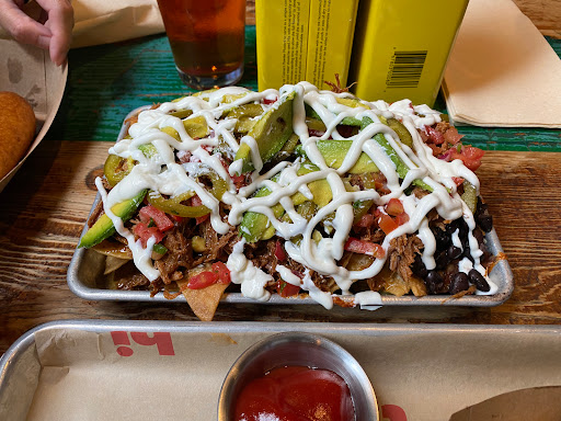 I love the atmosphere of this place. Always super fun and chill. Lots of beer to choose from and the mixed drinks are tasty too.... But even better, the food! The Kale Caesar salad is my favorite and I dont even really like caesar salads. The nachos are huge and can feed 4 people (okay unless youre really hungry then maybe only 2 people!) The Ahi Burger is delicious Great food, great drinks, fun atmosphere.