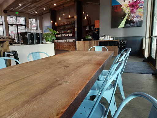 Downtown trendy coffee bar with good coffee including fancy designs to top them off, plenty of open space and tall ceilings great for meeting friends, unfortunately the Internet wasnt working great that day or it blocks craigslist and a few other main sites I tried. There are few to non charging plugs for charging computers oh and all parking in the area is metered paid parking.